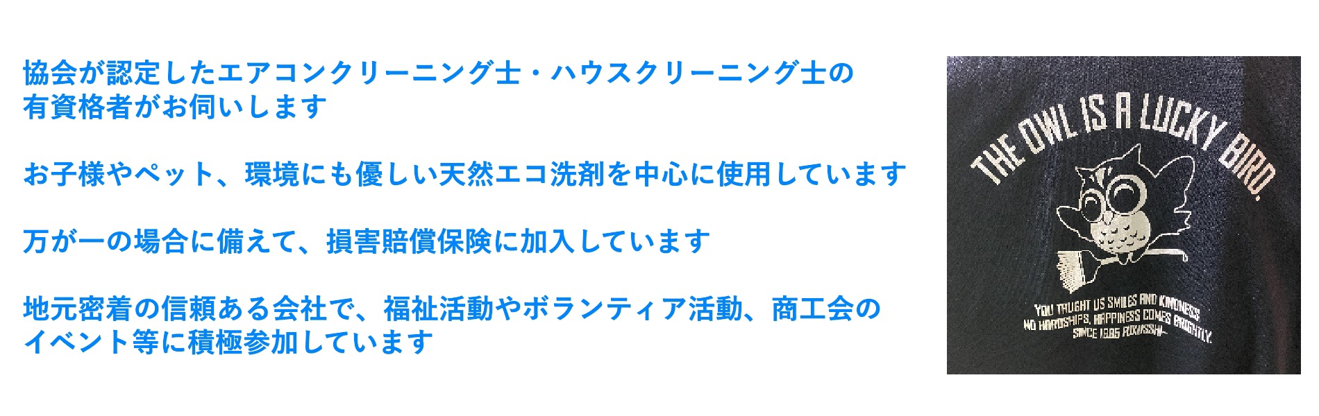 NPO法人日本ハウスクリーニング協会・一般社団法人日本エアコンクリーニング協会に加盟し、徹底した教育を受けたハウスクリーニング士がお伺いします。